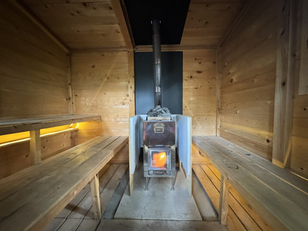 広さも十分で、6〜7人は入れるゆとり。薪も最初から焚べてあり、到着してすぐ入れるのが最高。サウナハットやマットも完備で、完全手ぶらでサ活可能!