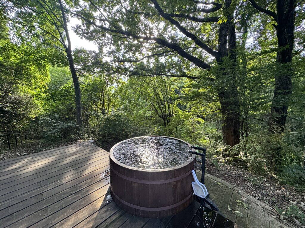 水温は21℃前後(季節によって変動あり?)。お湯の蛇口も付いていて、壺湯サイズで二人並んで入れる贅沢仕様。目の前に広がる景色を眺めながらのクールダウンは格別。